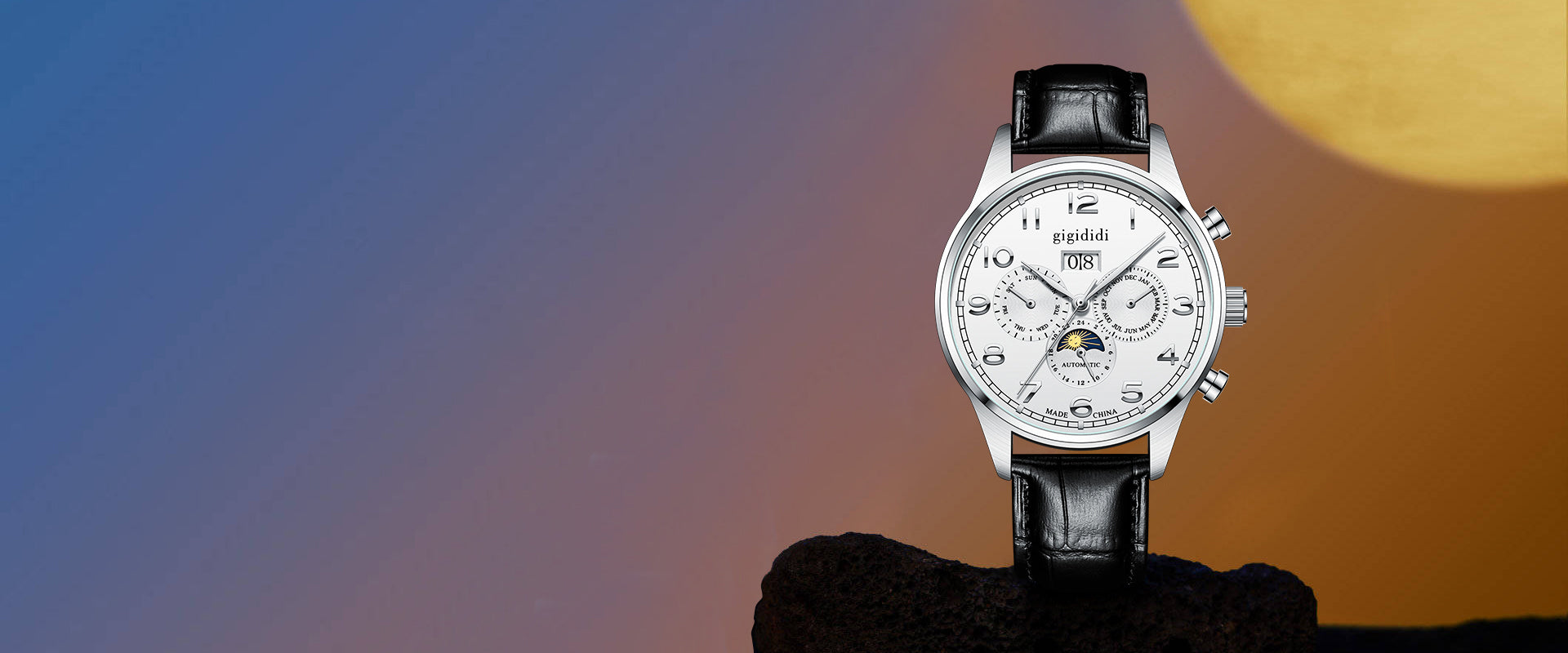 Gigididi 43mm Automatic Men's Watch Date Day Month Year Gold Dial Multifunction 316L Leather Strap Polished Case Day Night New